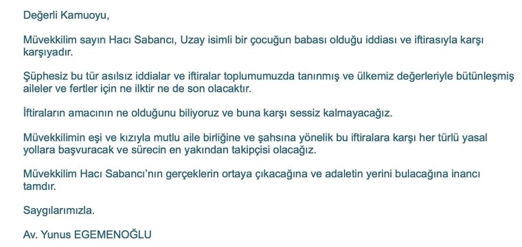 İddialar kısa sürede gündem olurken, Hacı Sabancı'nın avukatı Yunus Egemenoğlu'ndan açıklama geldi. Kamuoyuna seslenen Egemenoğlu, müvekkili Hacı Sabancı'nın bir iftirayla karşı karşıya olduğunu, iftiraların amacının ne olduğunu bildiklerini ve sessiz kalmayacaklarını bildirdi.