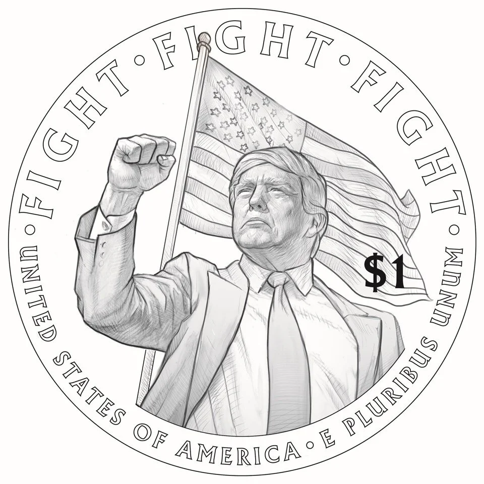 ABD Maliye Bakanı Brandon Beach Ofisi tarafından denetlenen madeni paranın taslak tasarımında, madeni paranın bir yüzünde Trump'ın profili yer alıyor. Taslağın diğer yüzünde ise Trump, Amerikan bayrağı önünde yumruklarını sıkmış bir şekilde tasvir edilirken, yanında "SAVAŞ, SAVAŞ, SAVAŞ" yazısı yer alıyor.