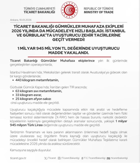 Ticaret Bakanlığı Gümrükler Muhafaza ekipleri, 2026 yılının ilk günlerinde İstanbul Havalimanı ve Gürbulak Gümrük Kapısı’nda iki yarı operasyon gerçekleştirdi.