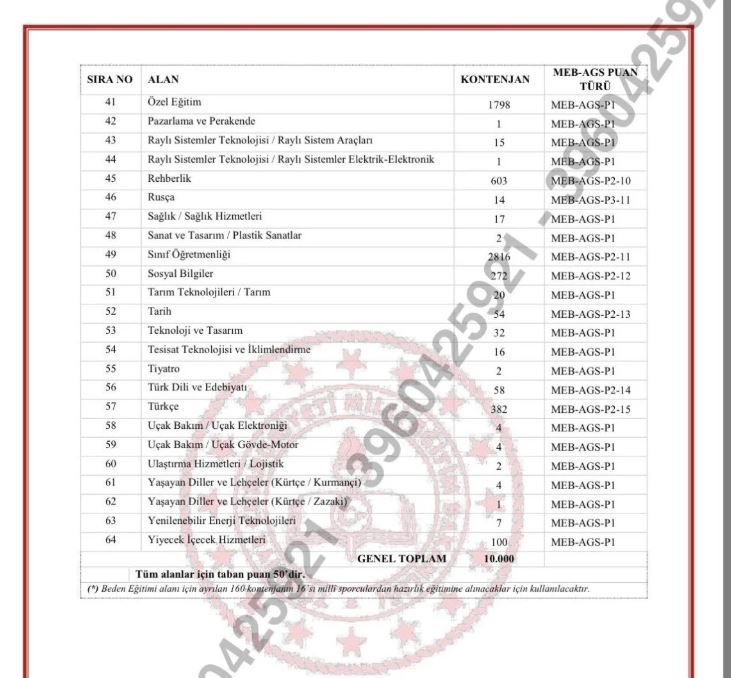 Alanlar itibarıyla MEB-AGS puan üstünlüğü esas alınarak her alan için kontenjan sayısı kadar asıl aday, asıl aday sayısının en fazla yüzde 10'u kadar da yedek aday belirlenecek.