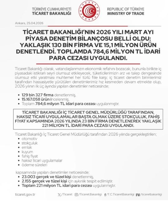 Bakanlıktan yapılan yazılı açıklamada, 2026 yılı mart ayı sonu itibarıyla piyasa denetim bilançosu paylaşıldı.