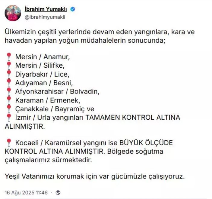 Tarım ve Orman Bakanı İbrahim Yumaklı, sosyal medya hesabından yaptığı açıklamada, "Ülkemizin çeşitli yerlerinde devam eden yangınlara, kara ve havadan yapılan yoğun müdahalelerin sonucunda; Mersin Anamur, Mersin Silifke, Diyarbakır Lice, Adıyaman Besni, Afyonkarahisar Bolvadin, Karaman Ermenek, Çanakkale Bayramiç ve İzmir Urla yangınları tamamen kontrol altına alınmıştır. Kocaeli Karamürsel yangını ise büyük ölçüde kontrol altına alınmıştır. Bölgede soğutma çalışmalarımız sürmektedir. Yeşil vatanımızı korumak için var gücümüzle çalışıyoruz" ifadelerine yer verildi.