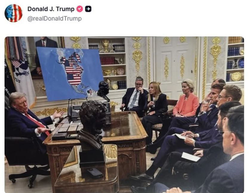 Trump’ın Truth Social hesabında paylaştığı fotoğrafta, Avrupalı liderlerle yapılan bir toplantı sırasında masanın yanında yer alan dünya haritası öne çıktı.