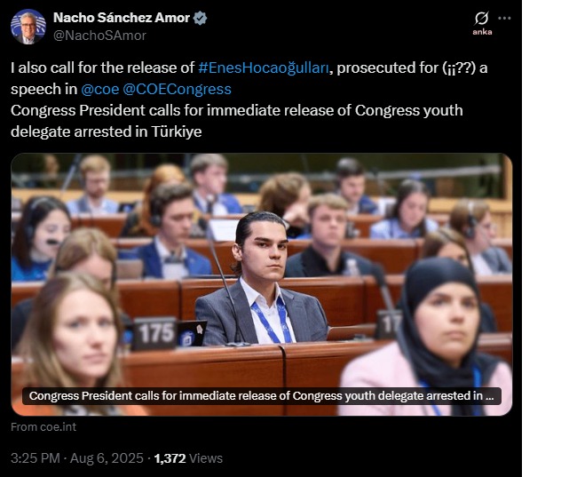 Avrupa Parlamentosu Türkiye Raportörü Nacho Sanchez Amor, paylaşımında "Avrupa Konseyi Kongresinde yaptığı konuşma nedeniyle yargılanan Enes Hocaoğulları'nın serbest bırakılmasını talep ediyorum" ifadelerini kaydetti.
