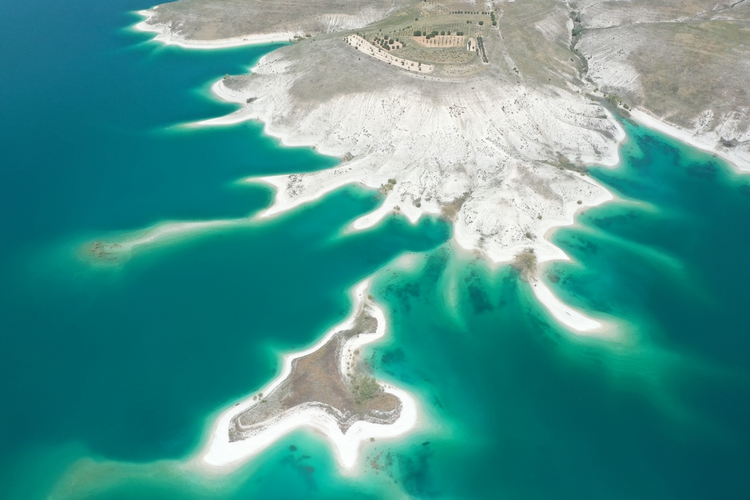Baraj gölü içinde bulunan yükseltiler, havaların ısınması sonucu suyun azalmasıyla adacıklara dönüşüyor.