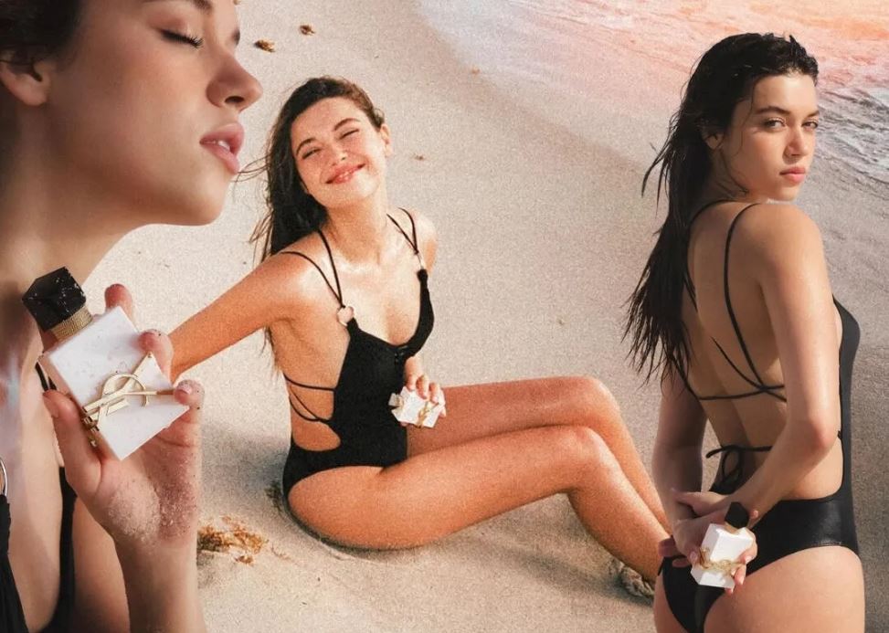 Ünlü oyuncu Afra Saraçoğlu, mayosunu giyip plajda elinde parfümle pozlar verdi.