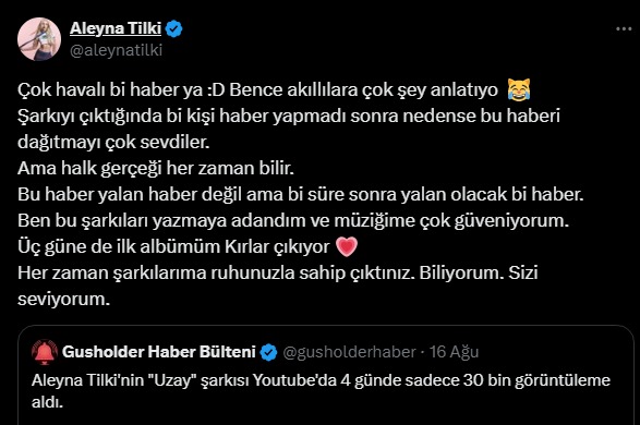 Aleyna Tilki, yeni şarkısı "Uzay"ın 4 günde sadece 30 bin kez dinlendiği yönündeki haberlere sosyal medya hesabından yanıt verdi.