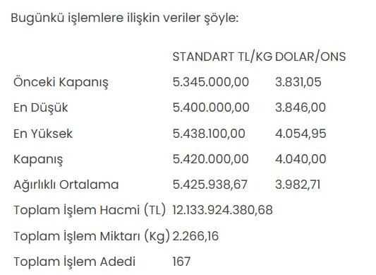 KMKTP'de altında toplam işlem hacmi 12 milyar 133 milyon 924 bin 380,68 lira, işlem miktarı ise 2 bin 266,16 kilogram oldu.