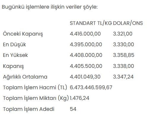 KMKTP'de altında toplam işlem hacmi 6 milyar 473 milyon 446 bin 599,67 lira, işlem miktarı ise 1.476,24 kilogram oldu.