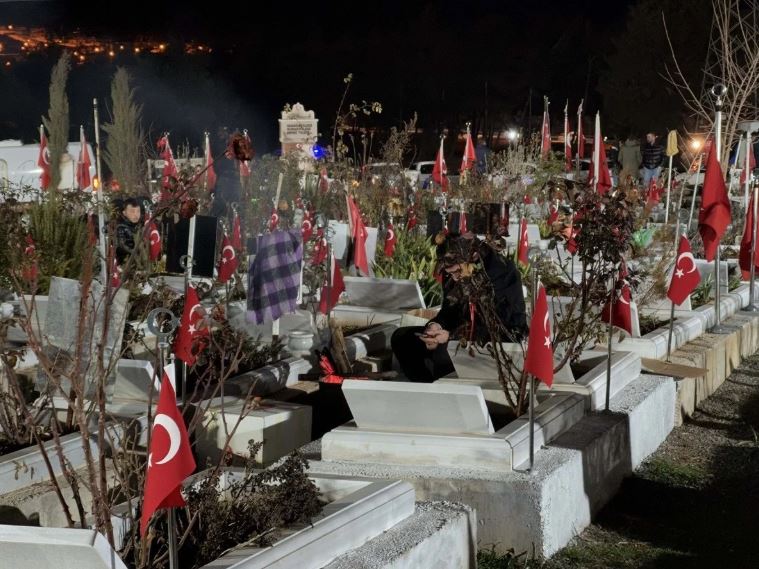 Gecenin karanlığına rağmen Kahramanmaraş Kapıçam Şehir Mezarlığı'na giden vatandaşlar yakınlarının kabirlerini sulayıp çiçek bıraktı.