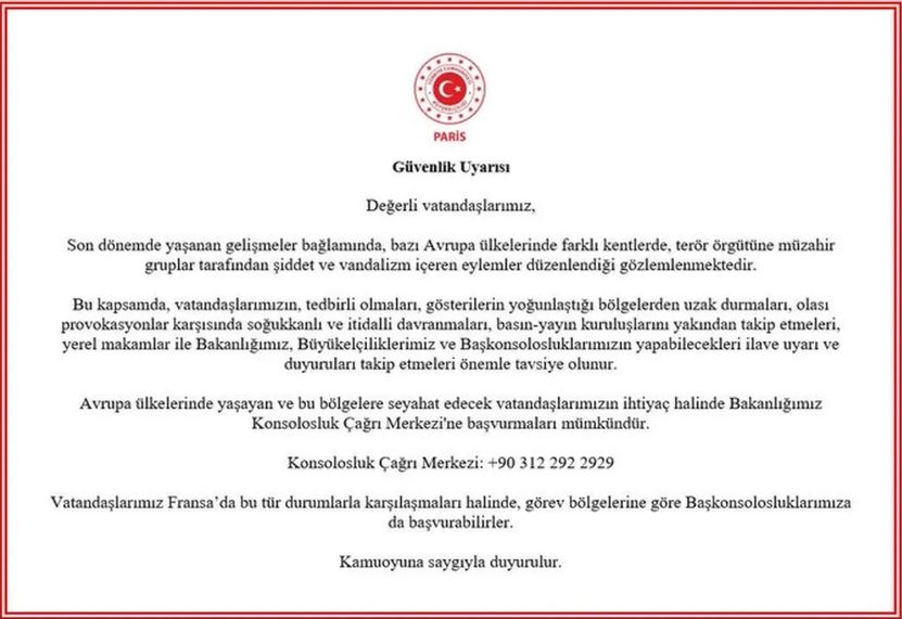 Londra Büyükelçiliği’nin ardından Paris Büyükelçiliği de güvenlik duyurusu yayımladı. Paris’ten yapılan paylaşımda, Fransa dahil bazı Avrupa ülkelerinde terör örgütüne müzahir grupların karıştığı şiddet ve vandalizm eylemlerine dikkat çekildi. Fransa’da yaşayan ve bu ülkeye seyahat edecek Türk vatandaşlarına, kalabalık alanlardan uzak durmaları ve resmi duyuruları yakından izlemeleri çağrısı yapıldı.