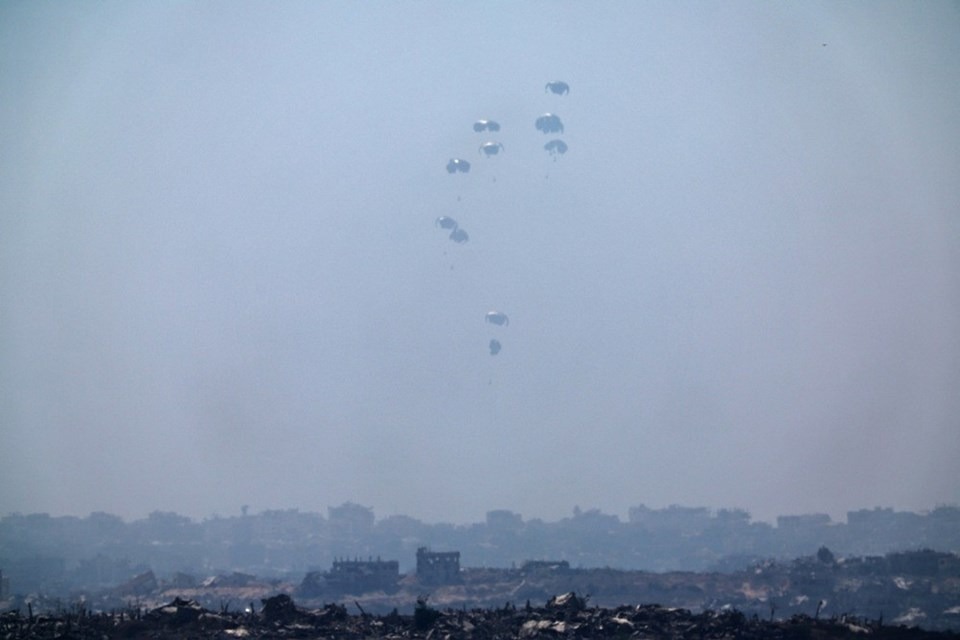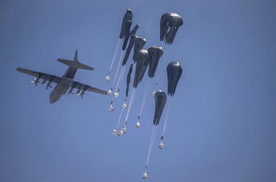 Ürdün Kraliyet Hava Kuvvetleri ve Birleşik Arap Emirlikleri (BAE) Hava Kuvvetleri ortak işbirliğiyle düzenlenen havadan ikmal yardımlarında Gazze Şeridi’ndeki farklı bölgelere paraşütlerle 25 tonluk gıda ve temel ihtiyaç malzemeleri bırakıldı.