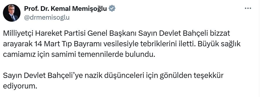 Milliyetçi Hareket Partisi Genel Başkanı Sayın Devlet Bahçeli bizzat arayarak 14 Mart Tıp Bayramı vesilesiyle tebriklerini iletti. Büyük sağlık camiamız için samimi temennilerde bulundu. Sayın Devlet Bahçeli'ye nazik düşünceleri için gönülden teşekkür ediyorum.