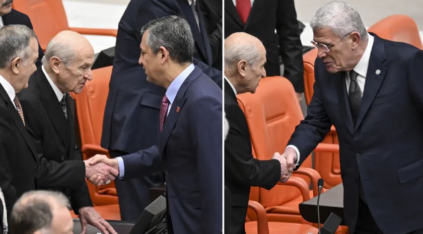Dervişoğlu ve Özel, görüşmeler öncesi Bahçeli'nin yanına giderek tokalaştı. AK Parti Genel Başkanvekili Ala da Bahçeli, Dervişoğlu ve Bakırhan ile selamlaştı.