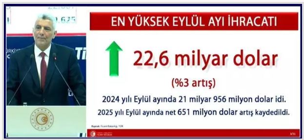 Eylül ayında ihracat, geçen yılın aynı ayına göre yüzde 3 oranında artışla 22,6 milyar dolara yükseldi. Böylece tarihin en yüksek eylül ayı ihracatı gerçekleştirildi.