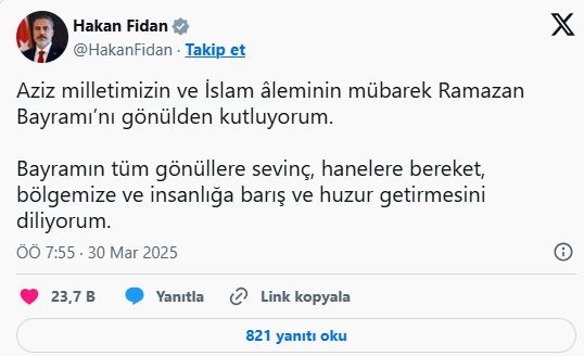 Dışişleri Bakanı Hakan Fidan, X sosyal medya platformundan yaptığı paylaşımla Ramazan Bayramı'nı kutladı.