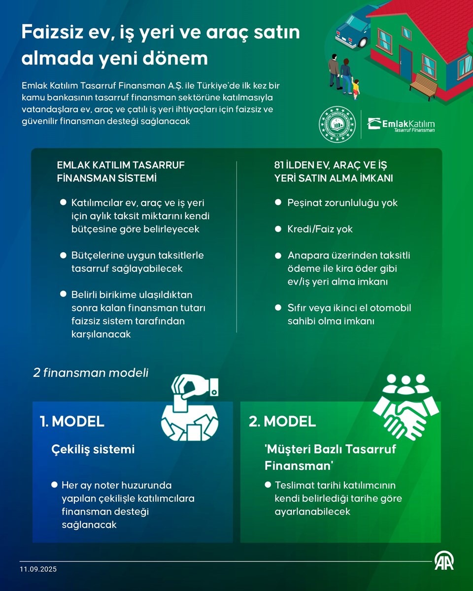 "Her şeyden önce bu sistemde kesinlikle faiz yoktur, doğrudan doğruya devlet güvencesi vardır. Bu sistemde, öncelikle katılımcılar Emlak Katılım Tasarruf Finansman güvencesiyle bir araya gelecekler. Her vatandaşımız kendi bütçesine uygun taksitlerle tasarruf yapacak. Vatandaşımız Emlak Katılım şubelerine gidecek. Faizsiz Finansman modeliyle satın almak istediği ev, araç ve iş yeri için aylık taksit miktarını kendi bütçesine göre belirleyecek. Burada vatandaşımıza iki model sunacağız. Birinci modelimizde çekiliş sistemi olacak. Yani her ay nasıl TOKİ'yle yaptığımız konutlarımızı noter huzurunda kura çekmek suretiyle veriyorsak burada da her ay noter huzurunda düzenli olarak yapacağımız çekilişlerle, sırası gelen katılımcılara finansman desteği sağlayacağız. Bu destekle de ister evini ve arabasını, ister iş yerini vatandaşımız alabilecek. İkinci modelde ise çekilişin olmadığı, 'Müşteri Bazlı Tasarruf Finansman' modelimizi uygulayacağız. Bu modelde müşteri teslimat tarihini çekilişle değil, orada kendi belirlediği tarihe göre ayarlayabilecek ve çekiliş olmadan ister peşinat ödeyerek, isterse tutarı taksitlerle bölerek yine evini, arabasını satın alabilecek. Her iki modelde de belirli bir birikimin ardından, orada kalan finansmanla ilgili Emlak Katılım Tasarruf Finans tarafından bu tutar karşılanacak ve vatandaşımız evinde oturmanın, dükkanını işletmenin, aracına binmenin mutluluğunu yaşarken kalan taksitlerini de rahatlıkla ödeyebilecek."