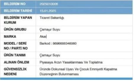 Tarım ve Orman Bakanlığı, zincir marketlerde satışa sunulan 'AKAR' marka çamaşır suyunun güvenlik standartlarına uymadığı gerekçesiyle toplatma kararı alındığını ve piyasaya arzının yasaklandığını açıkladı. Bakanlık, 15 Ocak tarihinde yayımlanan bildiride, ürünün çocuk güvenliği açısından ciddi riskler taşıdığına dikkat çekti.