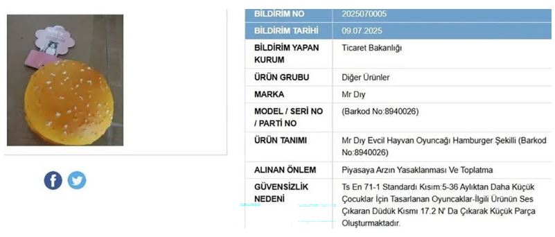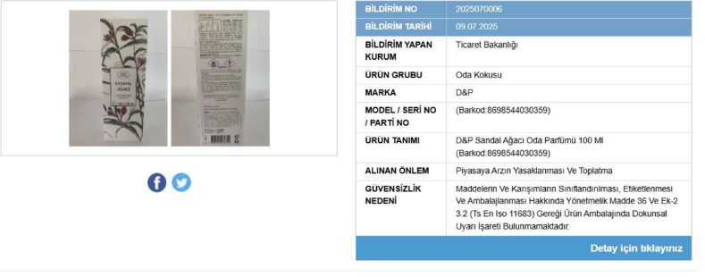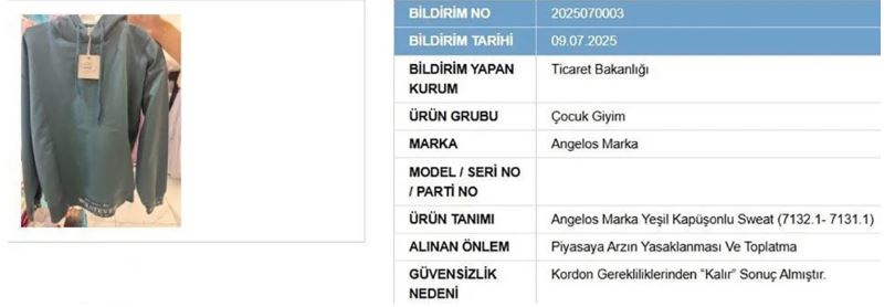 Yapılan açıklamaya göre, insan sağlığı ve tüketici güvenliğini tehdit eden bu ürünler arasında Zara Home’un “Vetiver Melon Hava Aromatize Edici” oda kokusu, D&P markasına ait “Sandal Ağacı Oda Parfümü 100 ml”, Mr. Dıy’ın hamburger şekilli evcil hayvan oyuncağı ve Angelos markalı yeşil kapüşonlu çocuk sweat ürünü yer aldı.