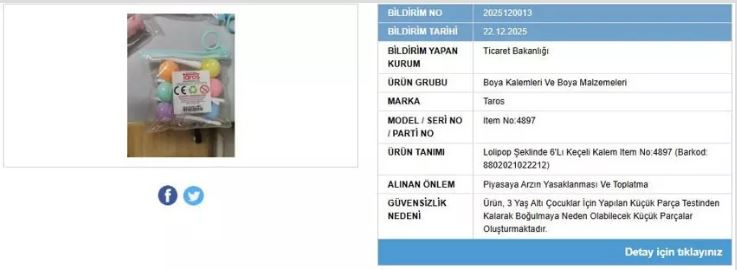 Yapılan denetimlerin ardından Bakanlık, Taros markalı bir kırtasiye ürününün kullanımının güvensiz olduğunu tespit etti.