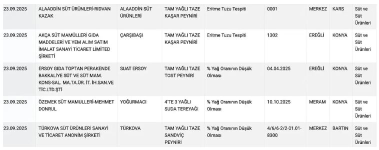 Merkezi Denizli'de bulunan Kocagöz markasının tam yağlı taze beyaz peynirinde yağ oranının düşük olması Bakanlık tarafından 'uygunsuz' bulundu. Kars'ta bulunan Alaaddin Süt Ürünleri tam yağlı taze kaşar peynirinde eritme tuzu kullanıldığı tespit edildi.