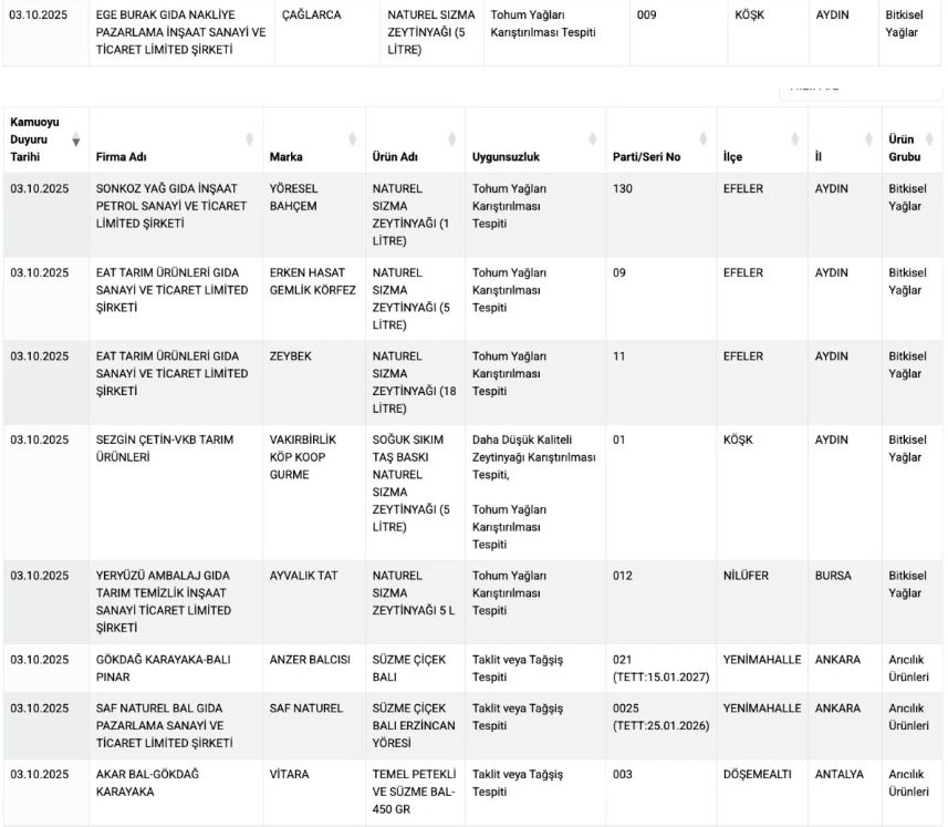 Tarım ve Orman Bakanlığı'nın sağlığı tehlikeye atan firmalar listesi ile Aynı Değeri Taşımayan Madde Eklenmesi İle Oluşturulan Taklit Veya Tağşiş Yapılan Gıdalar Listesindeki ihlallere yenileri eklendi.