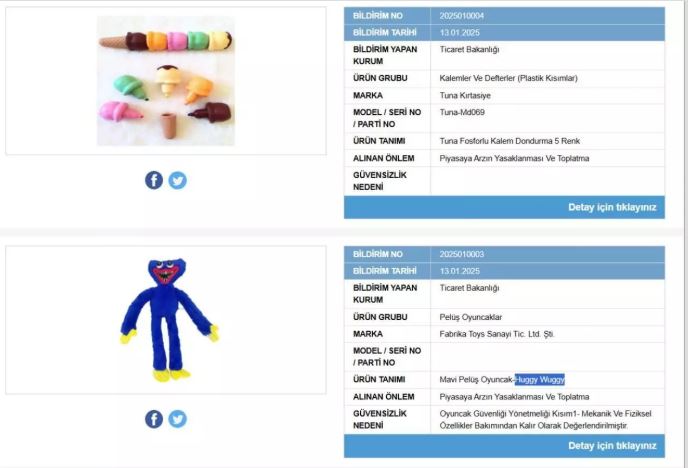 Bakanlığın son duyurusunda 2 oyuncak için piyasadan toplatılma kararı verildi. Bunlardan ilki "Tuna Fosforlu Kalem" olurken, ikincisi ise "Huggy Wuggy" karakterine ait olan pelüş oyuncak oldu. Her iki ürününde piyasaya arzı yasaklandı ve toplatılma kararı alındı.