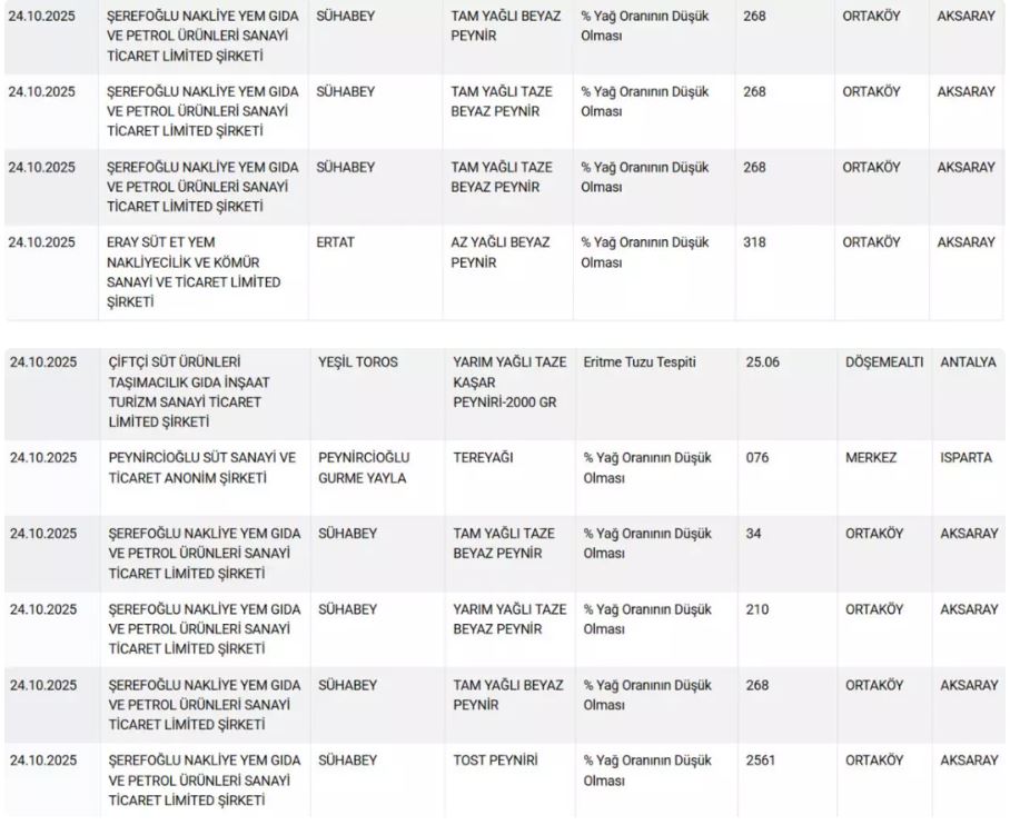 Güncellenen listede süt ürünleri dikkat çekti. Peynir, tereyağı ve yoğurt gibi ürünlerde hile yapan markalar tespit edildi.