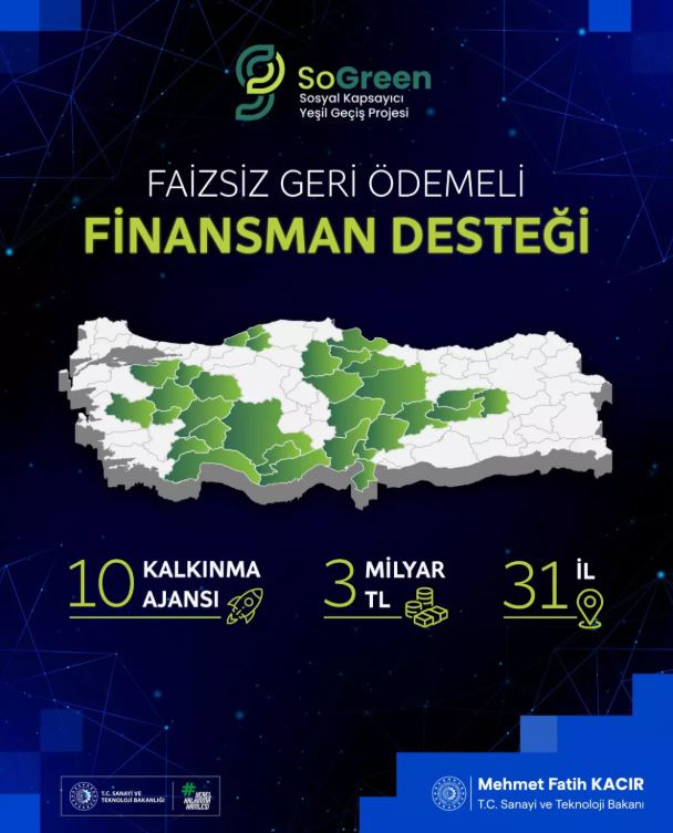 Sanayi ve Teknoloji Bakanı Mehmet Fatih Kacır, Sosyal Kapsayıcı Yeşil Geçiş (SoGreen) Projesi kapsamında yeni bir adımın atıldığını belirterek, Kalkınma Ajansları ile 3 milyar TL tutarında faizsiz finansman desteğini 31 şehirde hayata geçirileceğini ifade etti.