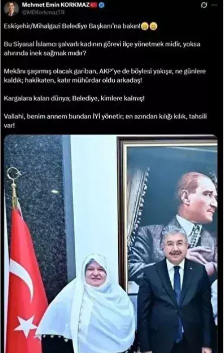 İYİ Partili olduğu belirtilen Mehmet Emin Korkmaz, Mihalgazi Belediye Başkanı Zeynep Güneş’in kıyafetleri ve şalvarını hedef alan bir paylaşımda bulundu.