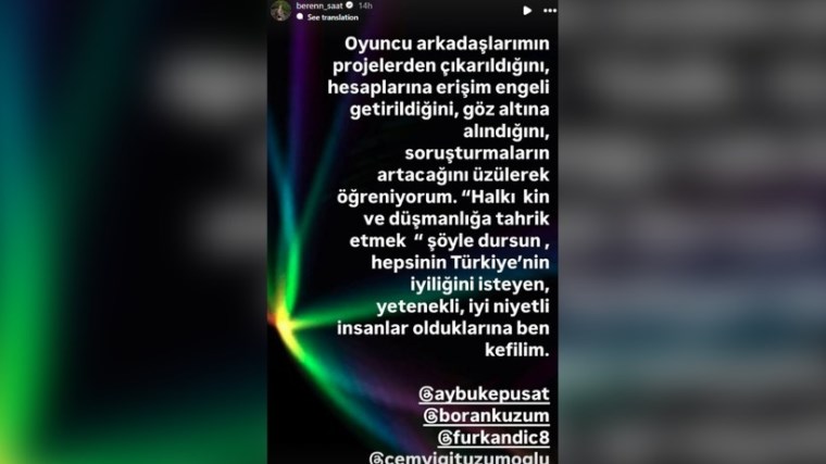 Gelişmelerin ardından sosyal medya hesabından bir paylaşım yapan ünlü oyuncu Beren Saat, yaşananlara tepki göstererek sanatçı arkadaşlarına destek verdi:
