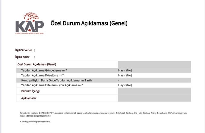 "Şirketimiz, toplamı 1.278.828.670 TL anapara ve faiz olmak üzere fon kullanım raporu çerçevesinde, T.C Ziraat Bankası A.Ş, Halk Bankası A.Ş ve Denizbank A.Ş'ye konsorsiyum kredi ödemesi gerçekleştirmiştir."