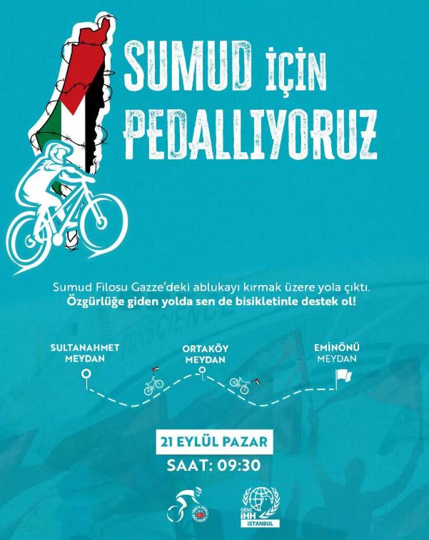 Dünyanın dört bir yanında Küresel Sumud Filosu’na destek olmak amacıyla etkinlikler düzenleniyor. Bu kapsamda İstanbul’da da anlamlı bir etkinlik düzenlenecek. İstanbullu bisiklet severler, filoya dikkat çekmek ve destek olmak amacıyla “Sumud İçin Pedallıyoruz” etkinliğinde bir araya gelecek.