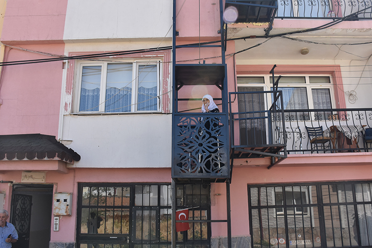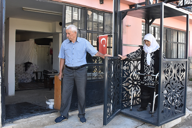 Osman Doğan, yürüteçle hareket edebilen eşinin eve girip çıkmakta zorlanması üzerine binanın dışına balkonlara kadar ulaşan asansör yaptırdı.