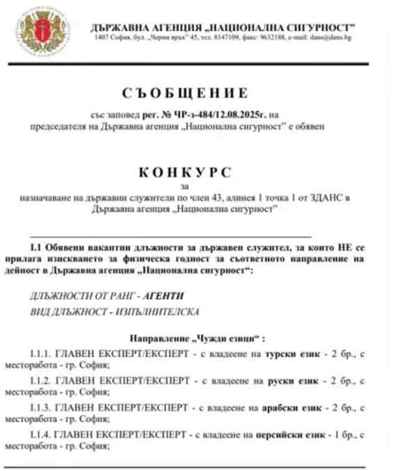 Bulgaristan'ın iç istihbarat ve karşı istihbarattan sorumlu kurumu olan Devlet Ulusal Güvenlik Ajansı, yeni ajan alımı için ilan açtı.