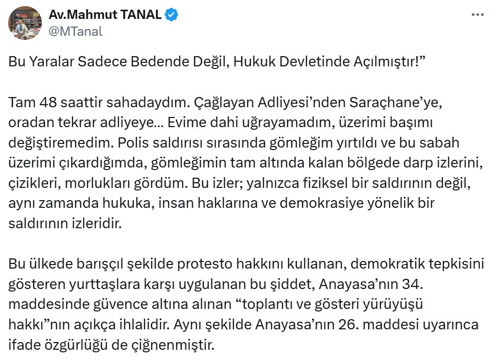 CHP İstanbul Milletvekili Mahmut Tanal, İstanbul Büyükşehir Belediye Başkanı Ekrem İmamoğlu'nun tutuklanmasını protesto eylemleri sırasında darp edildiğini duyurdu.