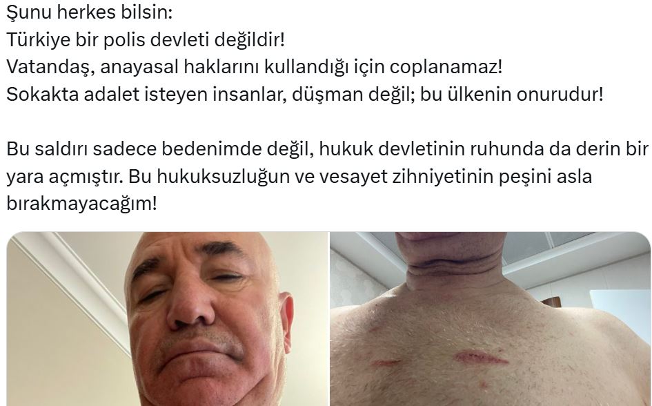 "Tam 48 saattir sahadaydım. Çağlayan Adliyesi’nden Saraçhane’ye, oradan tekrar adliyeye… Evime dahi uğrayamadım, üzerimi başımı değiştiremedim. Polis saldırısı sırasında gömleğim yırtıldı ve bu sabah üzerimi çıkardığımda, gömleğimin tam altında kalan bölgede darp izlerini, çizikleri, morlukları gördüm. Bu izler; yalnızca fiziksel bir saldırının değil, aynı zamanda hukuka, insan haklarına ve demokrasiye yönelik bir saldırının izleridir.