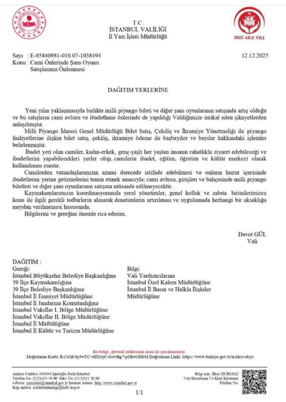 Valiliğe ulaşan şikayetlerde, özellikle yılbaşı öncesinde milli piyango bileti satışlarının cami önlerine kadar taşındığı belirtildi.