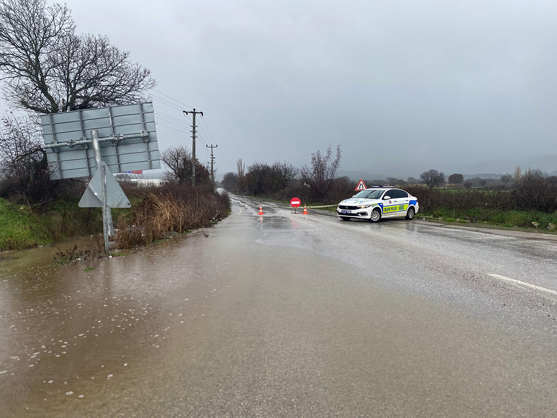Yağış nedeniyle Ayvacık ve Küçükkuyu arasındaki bağlantı yolu kapandı, sürücüler su birikintileri nedeniyle trafikte ilerlemekte güçlük çekti.