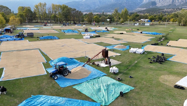 Traktörlerle ilçedeki harmanlara taşınan çeltik, burada geleneksel yöntemle, sonbahar güneşiyle kurutuluyor.