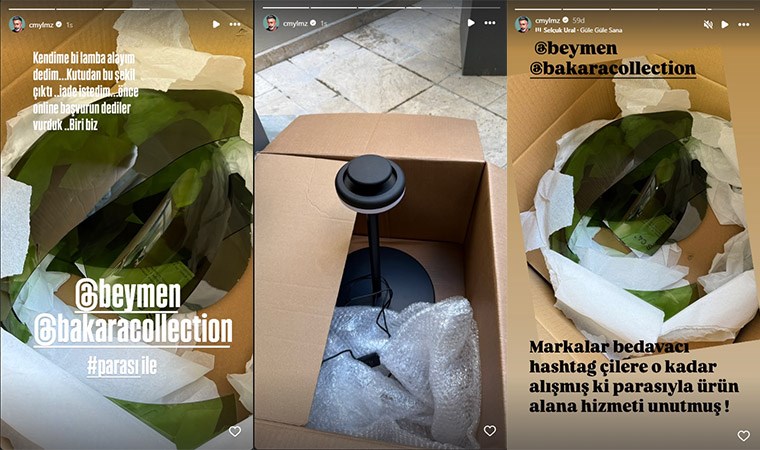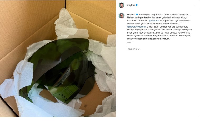 "Neredeyse 20 gün önce bu kırık lamba eve geldi…Fiziken geri gönderdim rica ettim yok dedi onlinedan kayıt oluşturun..ok dedik…@beymen in app inden kayıt oluşturdum arayan soran yok Lamba 43 bin lira dedim ya sabır…@Bakaracollection a mail attım dediler yok biz kontrol edip kutuya koyuyoruz ! Yani diyor ki Cem efendi lambayı kırmışssın bırak şimdi iade ayaklarını….Ben de huzurunuzda 43.000 tl lik lamba için markasına 43 milyonluk zarar veren bu arkadaşları kutluyor başarılarının devamını diliyorum."
