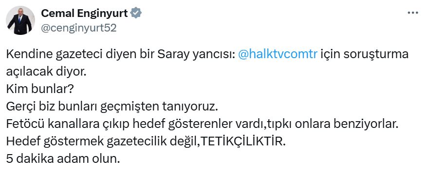 “Kendine gazeteci diyen bir Saray yancısı: Halk TV için soruşturma açılacak diyor. Kim bunlar? Gerçi biz bunları geçmişten tanıyoruz. Fetöcü kanallara çıkıp hedef gösterenler vardı, tıpkı onlara benziyorlar. Hedef göstermek gazetecilik değil, TETİKÇİLİKTİR. 5 dakika adam olun.”