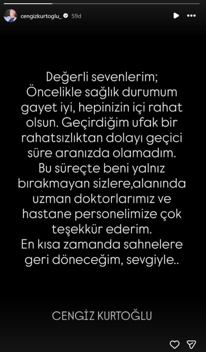 "Değerli sevenlerim; öncelikle sağlık durumum gayet iyi, hepinizin içi rahat olsun. Geçirdiğim ufak bir rahatsızlıktan dolayı geçici süre aranızda olamadım. Bu süreçte beni yalnız bırakmayan sizlere, alanında uzman doktorlarımız ve hastane personelimize çok teşekkür ederim. En kısa zamanda sahnelere geri döneceğim, sevgiyle.."