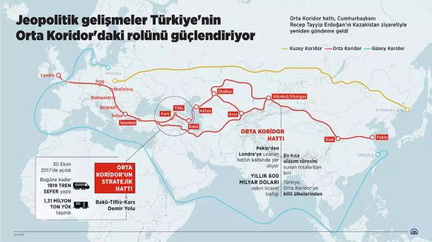 Cumhurbaşkanı Erdoğan, "Orta Koridor'un demiryolu üzerinden ticaret hacmi potansiyeli 75 milyar dolar seviyesinde. Kalkınma Yolu'yla jeopolitik imkanlarımızı tüm bölgemizin faydalanacağı kapsamlı bir ekonomik avantaja dönüştüreceğiz. Orta Koridor için projeleri hayata geçirdiğimizde 114 milyar dolarlık üretim etkisi ve yıllık ortalama 144 bin kişiye istihdam sağlanacağını öngörüyoruz. Kalkınma Yolu Projesi sayesinde Irak'ın Faw Limanı'na gelen yüklerin, ülkemiz üzerinden Avrupa'ya açılması bekleniyor." ifadelerini kullandı.
