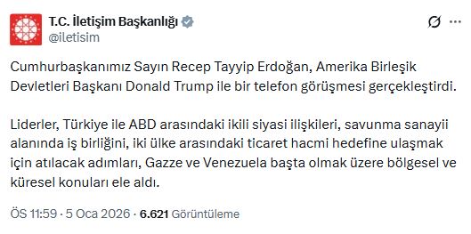 Cumhurbaşkanlığı İletişim Başkanlığı, Erdoğan ile Trump'ın görüşmesiyle ilgili olarak yayımladığı mesajda "Liderler, Türkiye ile ABD arasındaki ikili siyasi ilişkileri, savunma sanayii alanında iş birliğini, iki ülke arasındaki ticaret hacmi hedefine ulaşmak için atılacak adımları, Gazze ve Venezuela başta olmak üzere bölgesel ve küresel konuları ele aldı" ifadelerini kullandı.