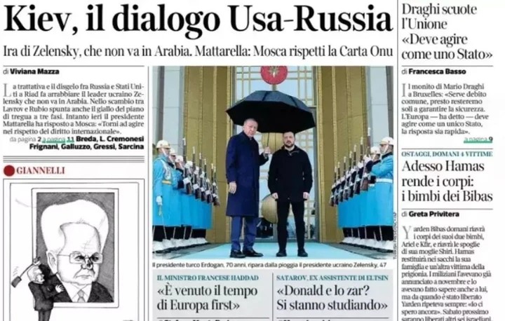 İtalyan Corriere Della Sera gazetesi, ön sayfasında Erdoğan'ın Zelenskiy'e şemsiye tuttuğu fotoğraf bulunurken, "Türkiye Cumhurbaşkanı Erdoğan, Ukrayna Cumhurbaşkanı Zelenskiy'yi yağmurdan koruyor" denildi.