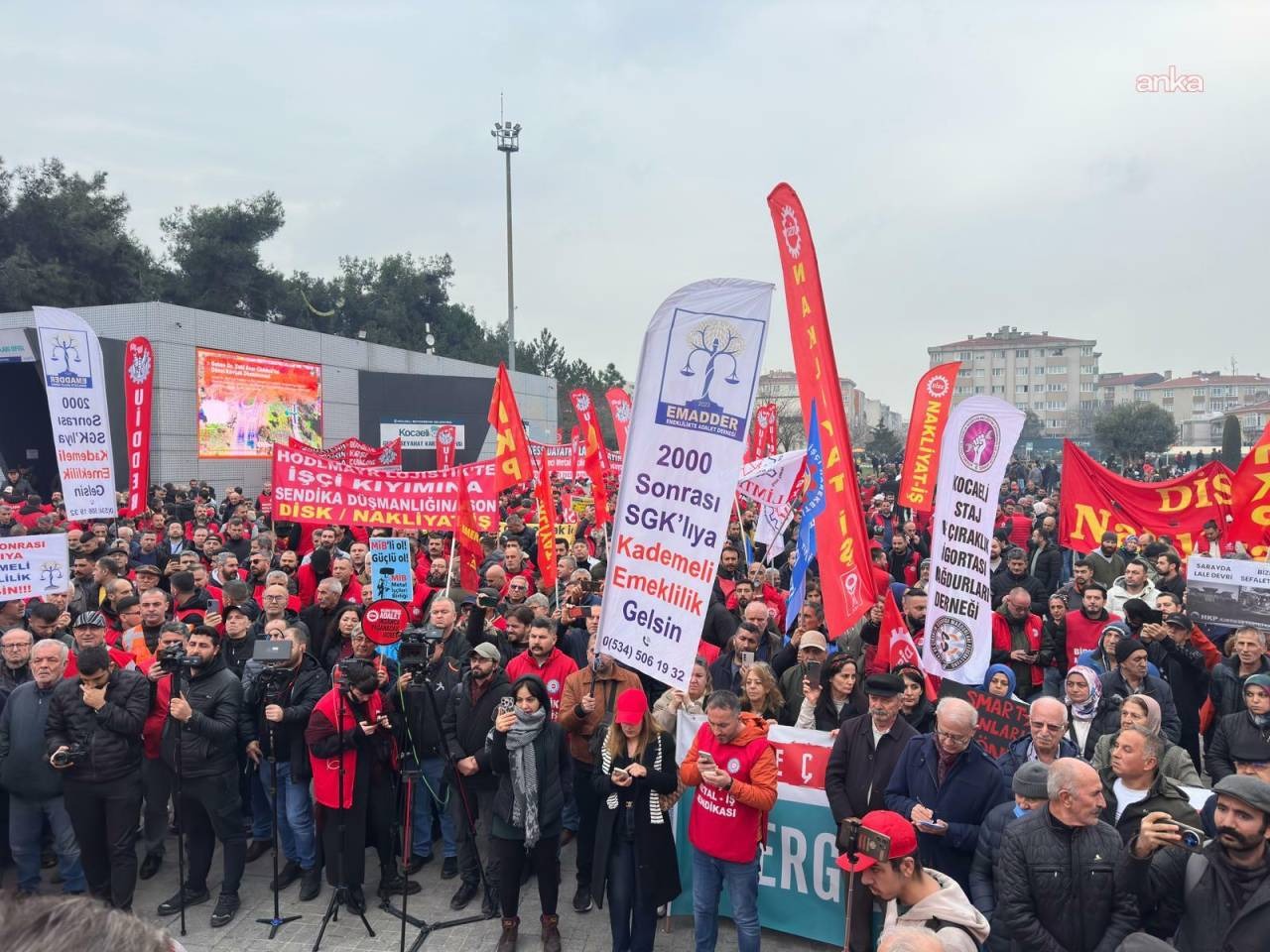 Alanı dolduran binlerce emekçi, “Direne direne kazanacağız”, “İnadına sendika inadına DİSK”, “Gelirde, vergide adalet istiyoruz”, “Yaşasın onurlu grevlerimiz”, “Yaşasın sınıf dayanışması”, “İşçiler açken patronlara huzur yok”, “Kahrolsun sarı sendikacılık” ve “Bu daha başlangıç mücadeleye devam” sloganları attı.