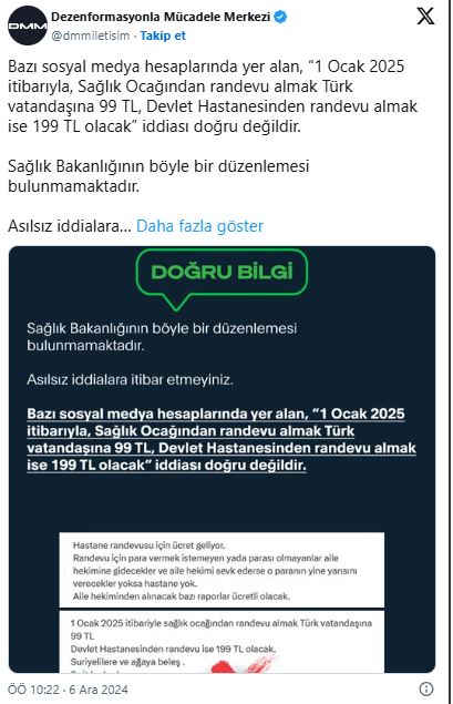 Cumhurbaşkanlığı İletişim Başkanlığı Dezenformasyonla Mücadele Merkezi'nden yapılan açıklamada, bazı sosyal medya hesaplarında, 1 Ocak 2025 itibarıyla sağlık ocağından randevu almanın 99 TL, devlet hastanesinden randevu almanın ise 199 TL olacağı yönündeki iddialar hatırlatıldı.