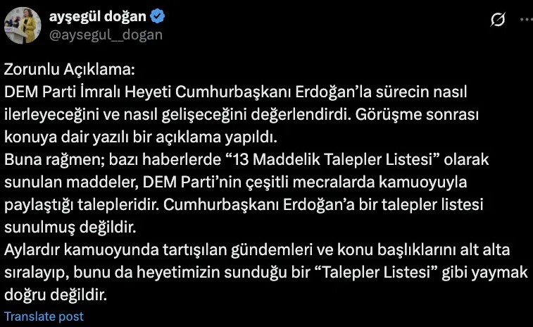 DEM Parti Sözcüsü Ayşegül Doğan da sosyal medya hesabından, "DEM Parti İmralı Heyeti Cumhurbaşkanı Erdoğan'la sürecin nasıl ilerleyeceğini ve nasıl gelişeceğini değerlendirdi. Görüşme sonrası konuya dair yazılı bir açıklama yapıldı. Buna rağmen; bazı haberlerde "13 Maddelik Talepler Listesi" olarak sunulan maddeler, DEM Parti'nin çeşitli mecralarda kamuoyuyla paylaştığı talepleridir. Cumhurbaşkanı Erdoğan'a bir talepler listesi sunulmuş değildir. Aylardır kamuoyunda tartışılan gündemleri ve konu başlıklarını alt alta sıralayıp, bunu da heyetimizin sunduğu bir "Talepler Listesi" gibi yaymak doğru değildir" mesajını paylaştı.