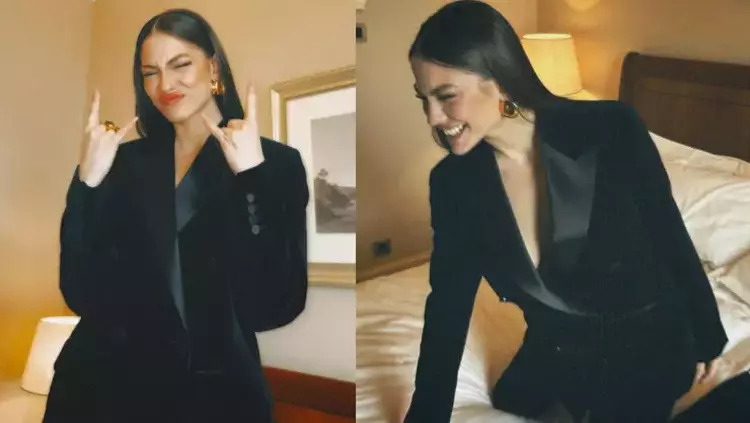 Yatağın üzerinde siyah takım elbisesiyle poz veren Demet Özdemir, eğlencesi ve neşeli halleriyle dikkat çekti.